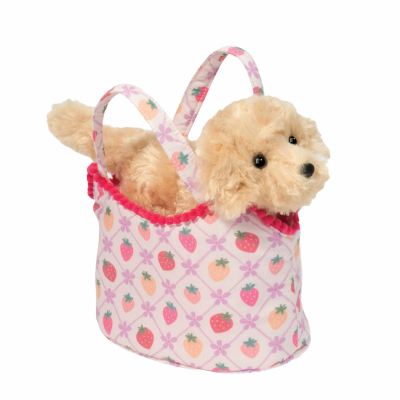 A tiny golden pup peeks out from its stylish little sak, ready to tag along on every adventure! With a swishy pink bag, sweet patterns, and a dash of sass, this cuddly companion pops in and out—part playful friend, part fashionable sidekick, always up for a stroll and a snuggle.