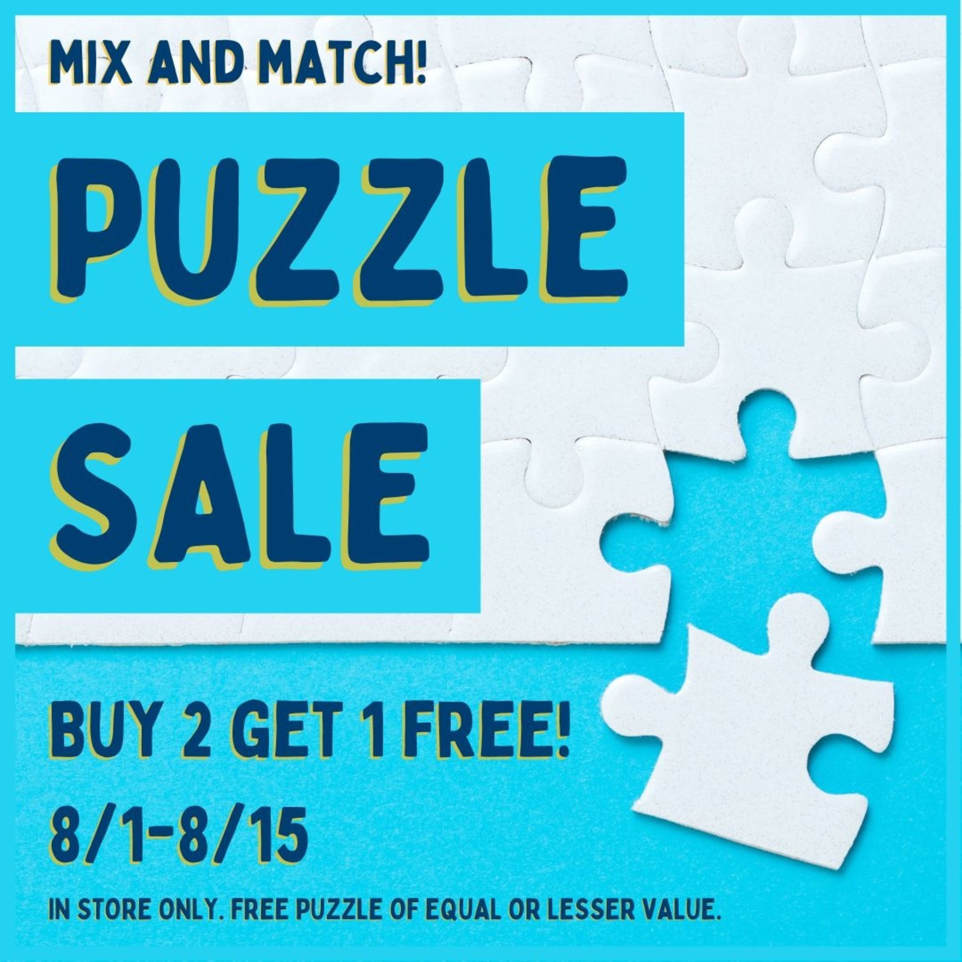 This in-store only promotion runs between August 1st and August 15th. It's a great time to stock up on puzzles for the whole family! Mix and match and puzzles to buy 2 and get 1 free (free puzzle of equal or lesser value).