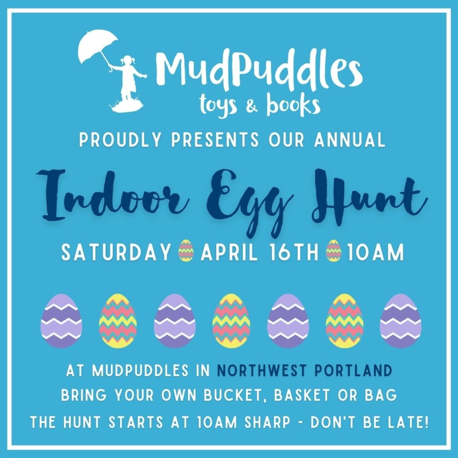 Join us on Saturday, April 16th, at 10 am at MudPuddles in Northwest Portland for the return of our annual Indoor Easter Egg Hunt. We'll be hiding 1000 Easter Eggs inside the store! Bring your own basket, bucket or bag and join the fun. The hunt starts right at 10 am and ends when all the eggs are found, so don't be late! This is a free activity at our Northwest Portland store.