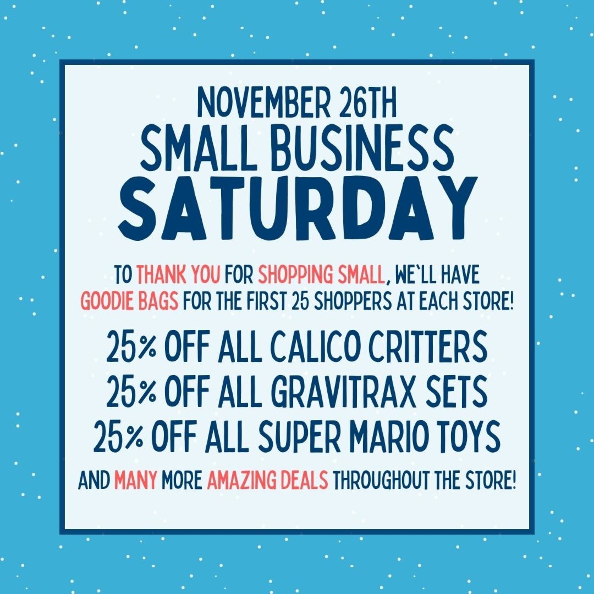 Saturday, November 26th is Small Business Saturday. To celebrate, we'll be giving away gift bags filled with fun goodies to the first 25 shoppers at each store! We will also have tons of amazing toys on sale, so it is the perfect time for holiday shopping. Here is just a hint of what will be on sale all day for Small Business Saturday: 25% off ALL Calico Critters, 25% off ALL Gravitrax, and 25% of ALL Super Mario Toys, 25% off ALL Roller Coaster Building Sets, 25% off all Lumipets. We will have fun things at great prices throughout the store! These discounts apply to in store purchases on in stock items only.