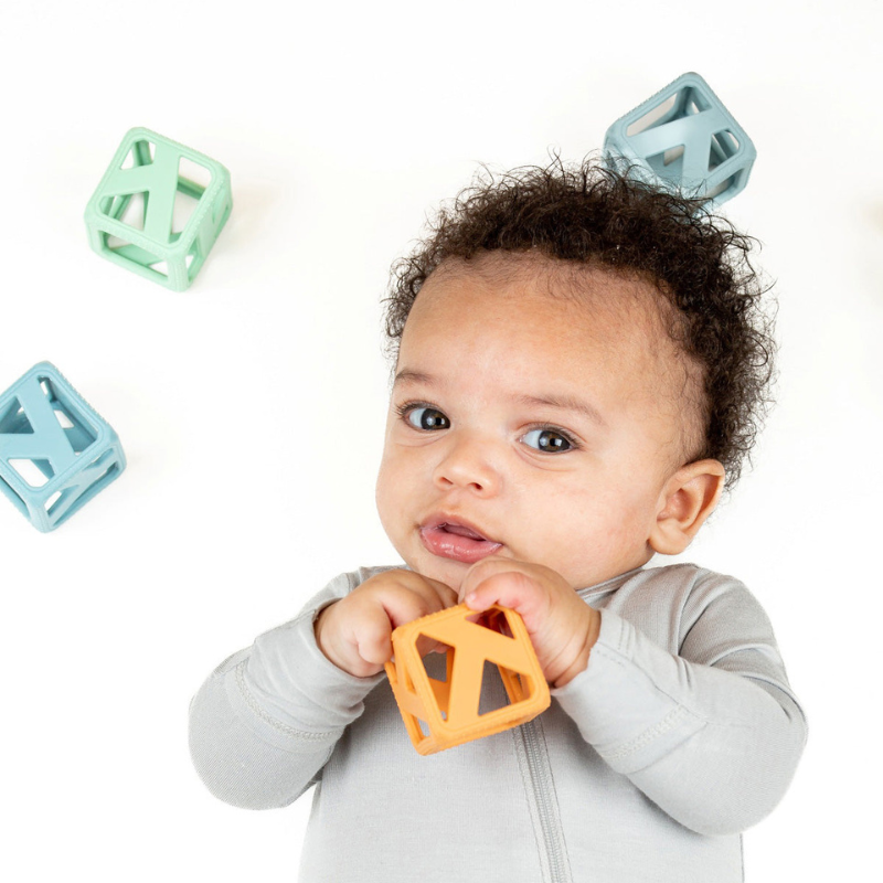 Designed with love by a mom, this Stack N Chew Mini Cubes and Chew Cube bundle is the perfect present for babies and makes teething time easier for new parents! A chic rattle and teether combo, the Chew Cube has soft, textured edges that soothe gums. Large flexible holes promote early gripping skills while baby is entertained with a gentle rattle! The four Stack N Chew Mini Cubes are also made of textured food-grade silicone, making them safe to teethe on and easy to stack. The contrasting colors stimulate hand-eye coordination and promote early fine motor skills.
