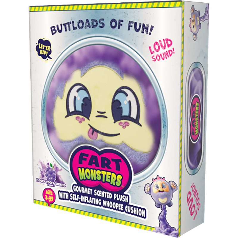 Meet the gang: Cheeky, Fizzler, Squeeky, Tootles, Windy, and Zipper. Each one is stuffed with soft plush, a gourmet scent, and a self-inflating whoopee cushion that lets out a silly sound when you sit, squeeze, or squish ’em. Fart Monsters bring laughter, surprise, and a little aroma to playtime. Bright, bold, and easy to squeeze, Fart Monsters are buttloads of fun! Plus, the yummy scent lasts for up to 2 years! Each scented style sold separately.