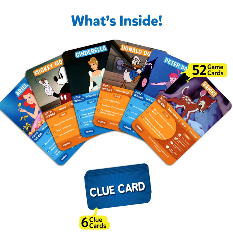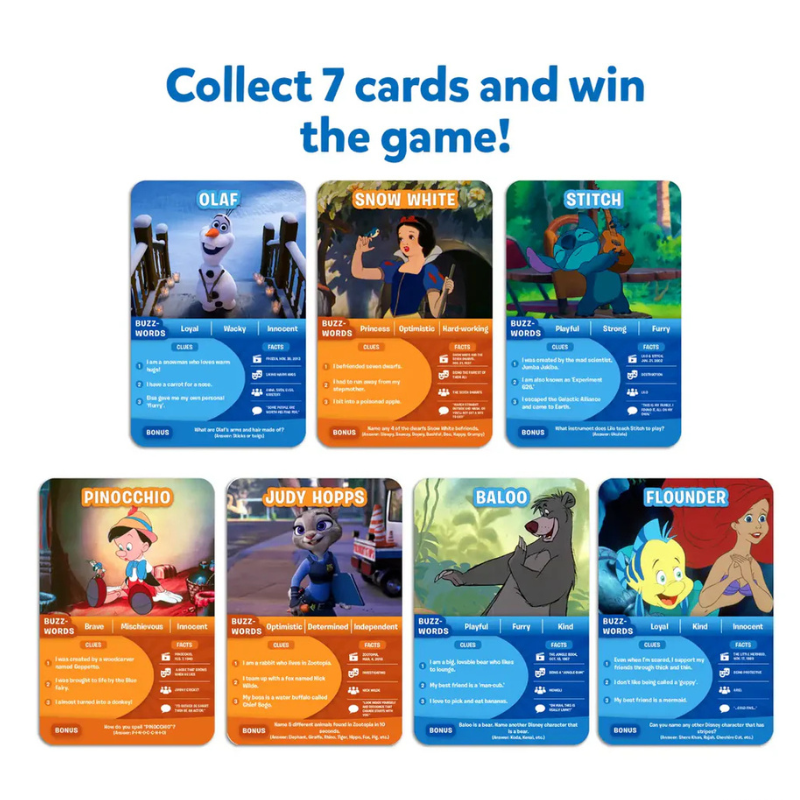 Disney superfans get their guess on, asking up to 10 questions to determine the character on the Game Card in play. Is the character an animal? Can this character fly? Does this character wear a blue gown? Think hard, ask smart questions, use clue cards wisely, and be the first player to collect 7 game cards to win! Featuring 52 favorite Disney characters, this fun card game is great for travel. For 2-6 players.
