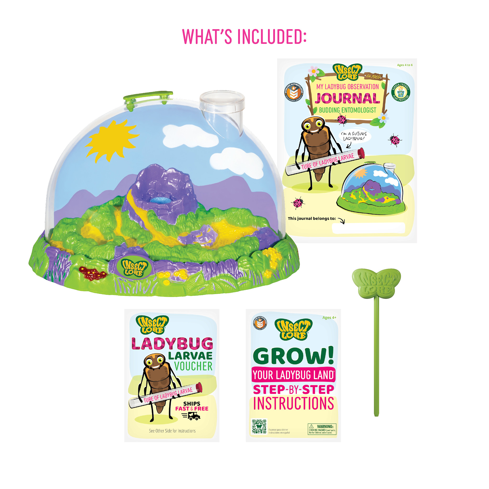 Young scientists love this hands-on opportunity to explore the fascinating life cycle of the Pink Spotted Ladybug! Over the course of 2 weeks, families watch larvae transform into pupae and then into adults inside the colorful diorama-style domed habitat. Kids love giving food and water to their ladybug friends as they observe them through the habitat's magnifying lid! Ladybugs can be released into the garden. Live insects not included; simply redeem the included voucher to recieve ladybug larvae and a Budding Entymologist Ladybug activity journal via mail. Kit also includes instructions and a watering dropper. It's a unique gift!