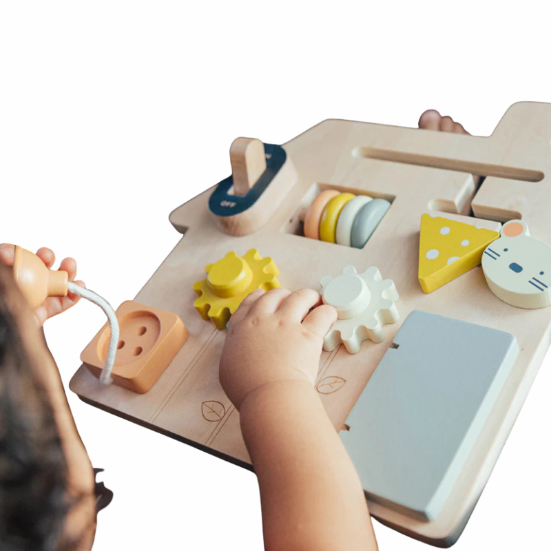Keep baby busy on the go with a compact, wooden, battery-free Busy Board! Babies and toddlers develop fine motor skills and enjoy tactile stimulation as they explore 6 super fun activities: a maze, abacus, peek-a-boo door with a surprise mirror, gears, switch and 3 prong plug. It’s sized perfectly for travel at 11.8″ x 2.8″ x 12.2″, and can be used flat on the floor or table, or propped up using the built-in kickstand.