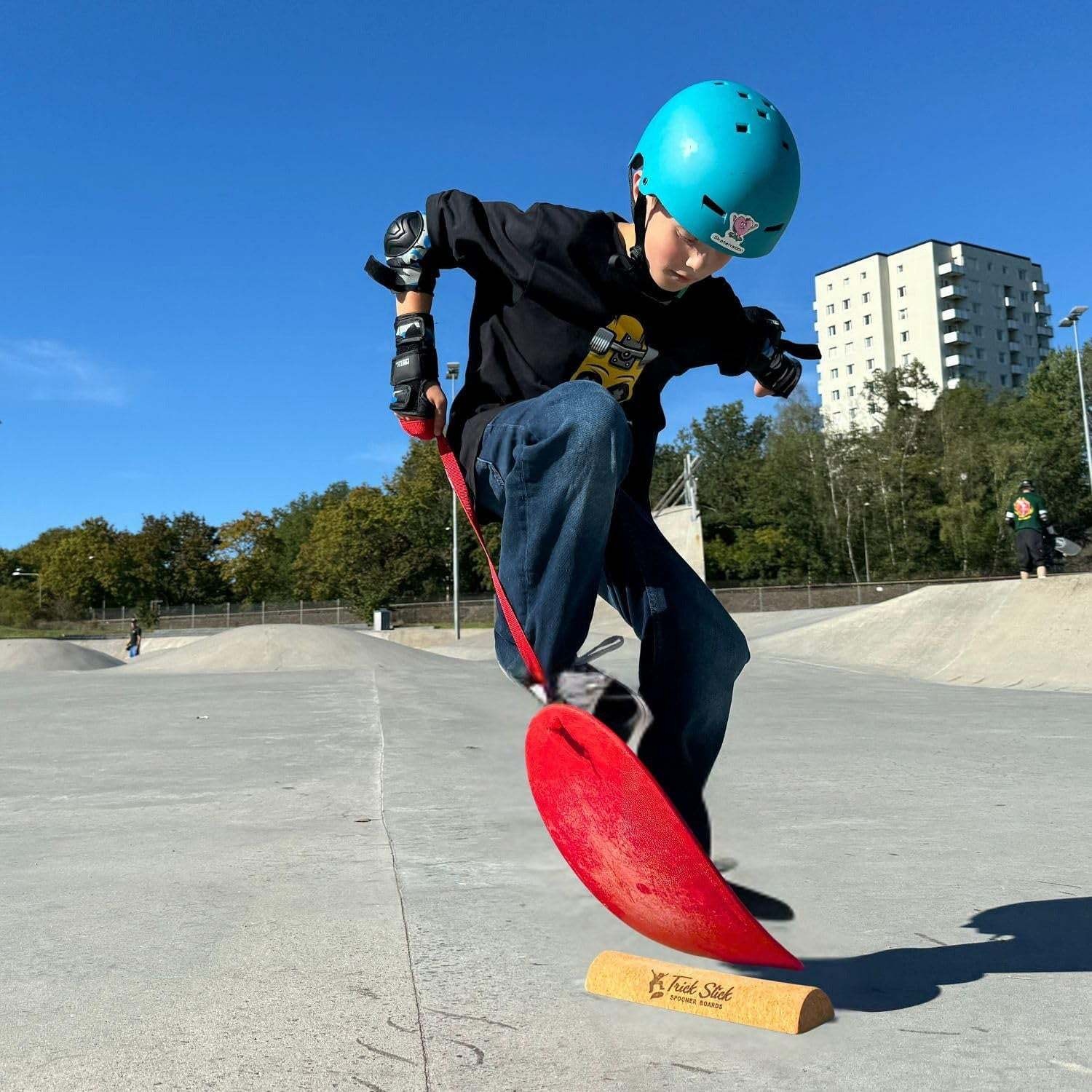 Get kiddos moving and build core strength and balance skills with The Spooner Born to Ride Training System! This Pro Package features a premium 26″ x 12″ board and is the easiest way for kids to learn to ollie, surf, skate, and snowboard. Suitable for all ages, but geared towards taller riders over 8 years old, this board allows users to have a wider, shoulder width stance. Kiddos gain confidence and enjoy full-bodied fitness fun as they flip, spin, slide, and learn tricks – indoors or out! Comes with Spooner Pro Model Board, trick rope for optional handle, instructions and how to ollie guide, 6.5 ft Spooner tow rope, game with 2 mini finger boards, trick stick rounded cork block, and a storage bag. Made in the USA.