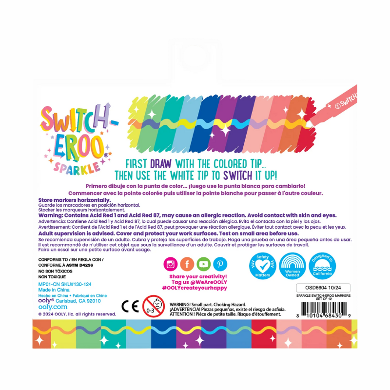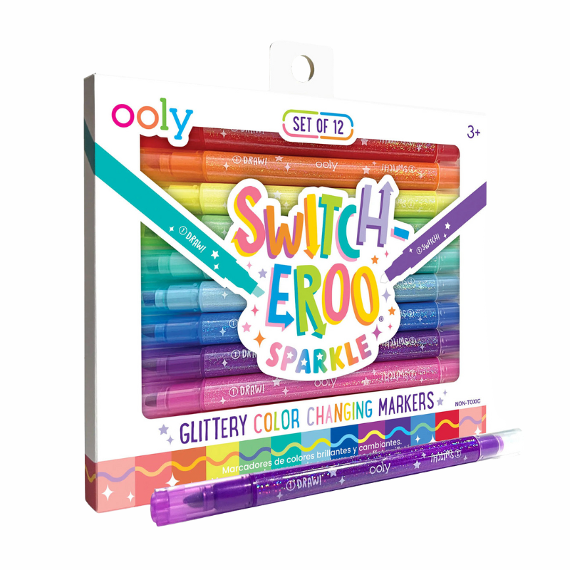 Switch up creativity and add sparkle to art time! This set of 12 color changing markers combines vibrant glittery hues with an exciting surprise: each marker is double-ended, featuring a dazzling chisel-tip glittery color on one side and a mystery white tip on the other that changes colors when layered on top. Add pizzazz to all creative endeavors: decorating cards, personalizing notebooks, or making school projects stand out.