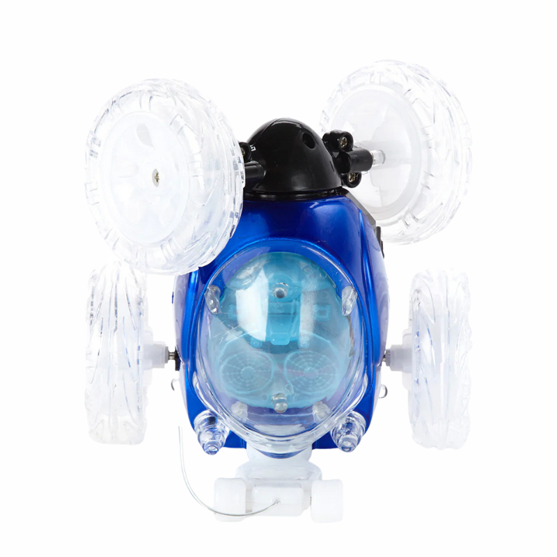 Impress friends and family with wild remote control car stunts! Ages 3+ easily use the handheld controller to make the Turbo Twister car flip 360 degrees on the rotating front axle, pop a wheelie, dance, tumble, and roll! Don’t worry about floor scuffs: the durable tires are safe for stunts on indoor surfaces. LED lights throughout the clear wheels illuminate the fun, day or night. Requires 5 AA batteries, not included.