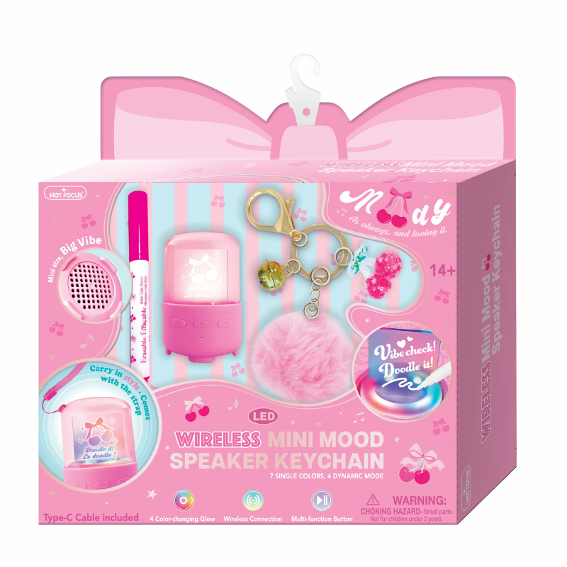 Clip on the Hot Focus Wireless Mini Mood Speaker and let the music follow you everywhere! This pint-sized powerhouse glows, shifts colors, and delivers rich sound—perfect for spontaneous dance breaks or setting the vibe on the go. With its cherry pompom pop and doodle-friendly surface for chalk marker magic, it’s a tiny speaker packed with massive fun. For ages 14+, it’s the ultimate mood-maker for teens ready to groove and shine.